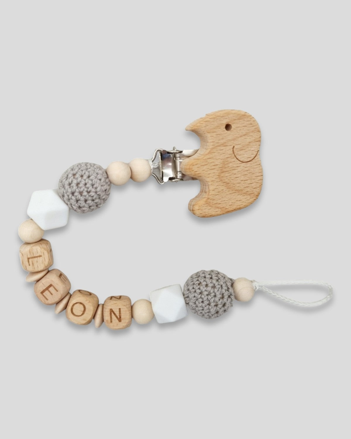 Schnullerkette mit Namen Löwe hell Grau weiß