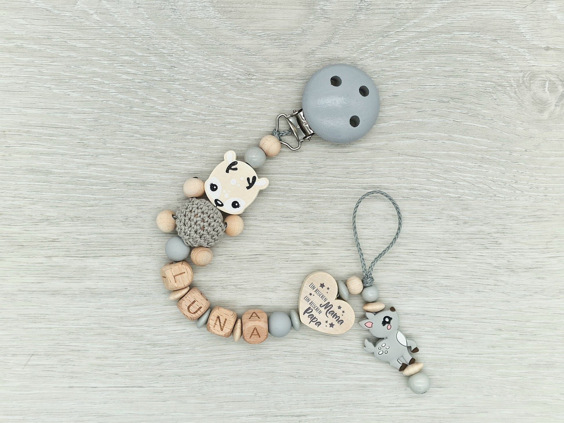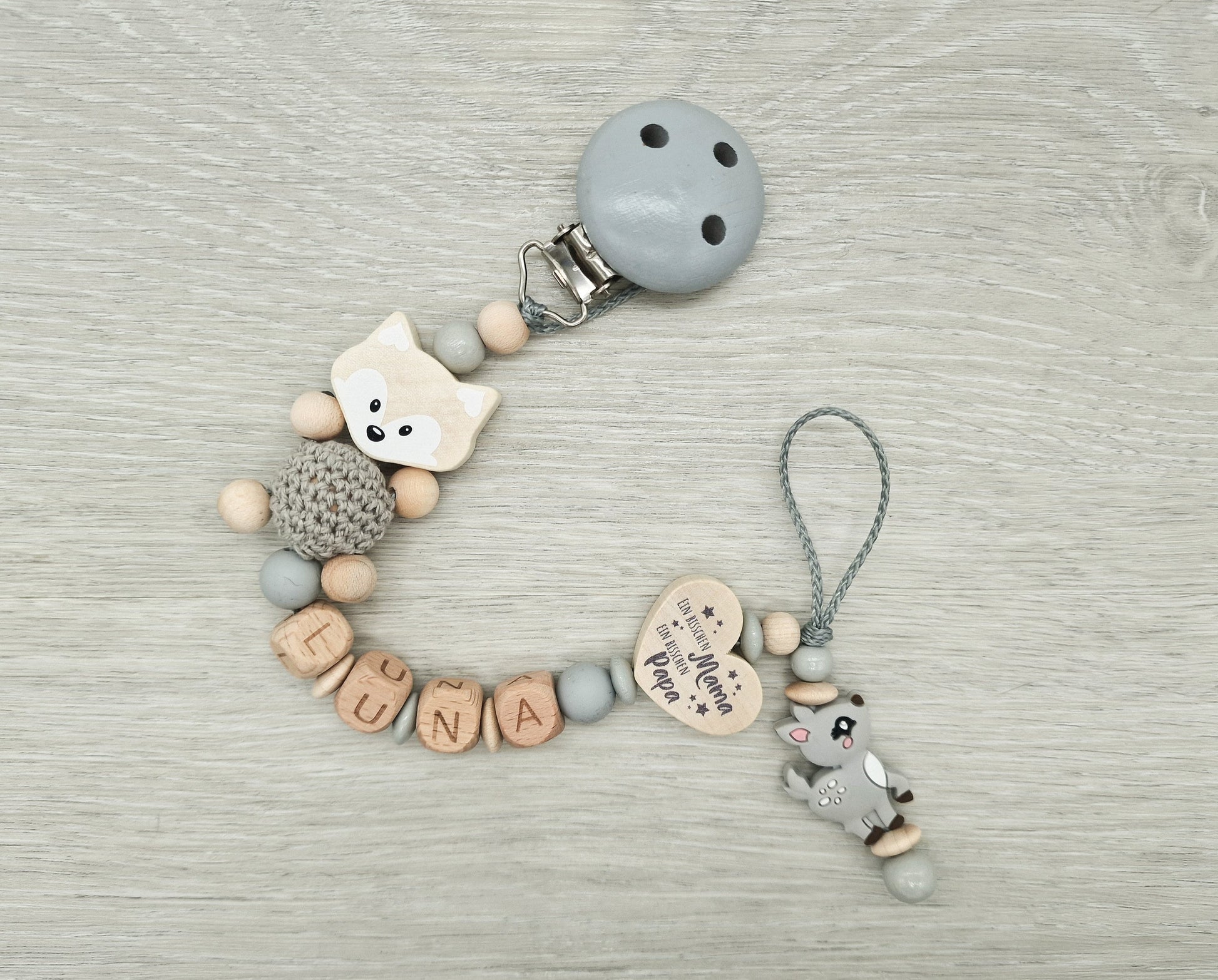Schnullerkette mit Namen Reh Herz mit Spruch, Ein bisschen Mama, ein bisschen Papa und ganz viel Wunder, Geschenk zur Geburt