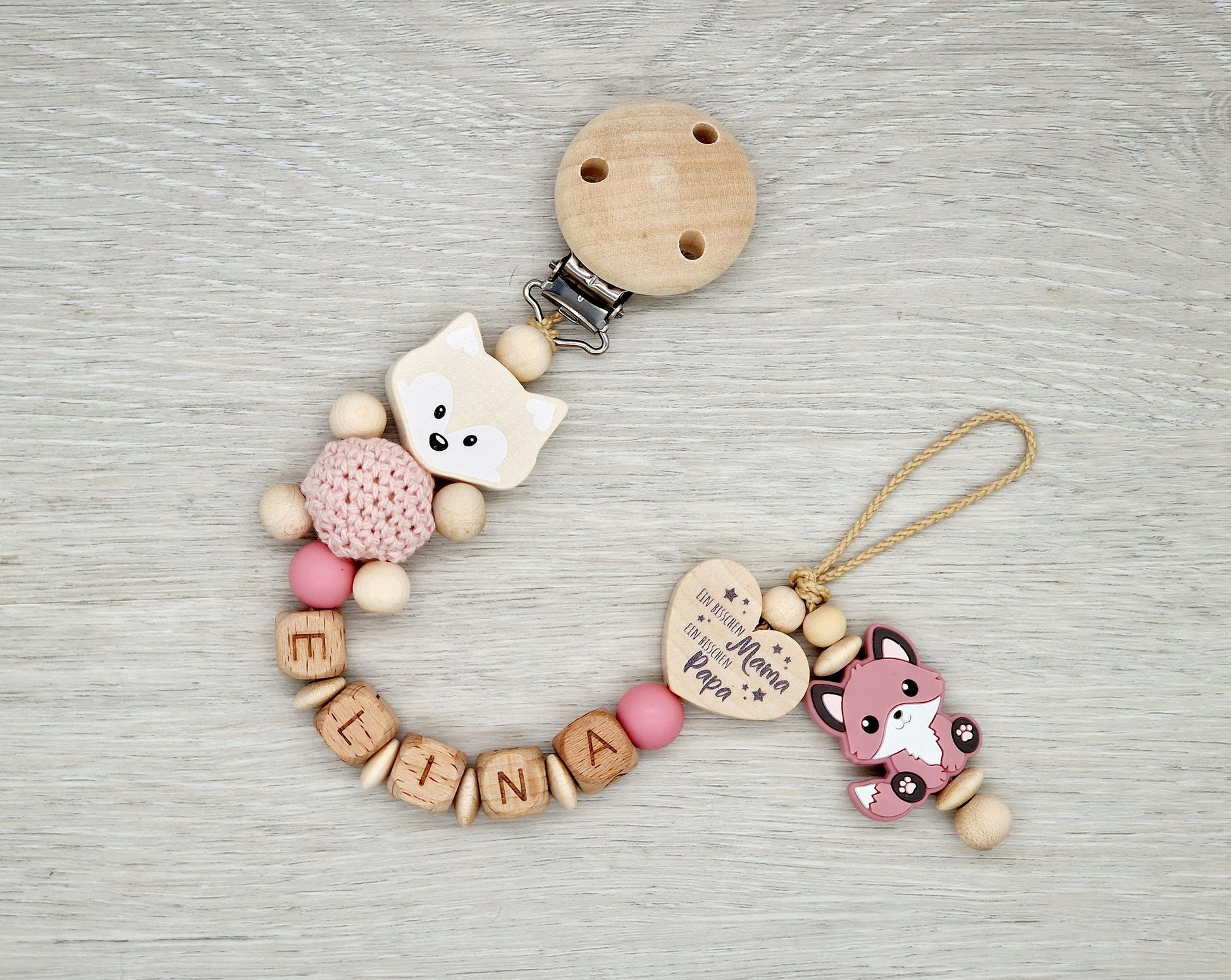 Schnullerkette mit Namen Reh Herz mit Spruch, Ein bisschen Mama, ein bisschen Papa und ganz viel Wunder, Geschenk zur Geburt Holz Blush